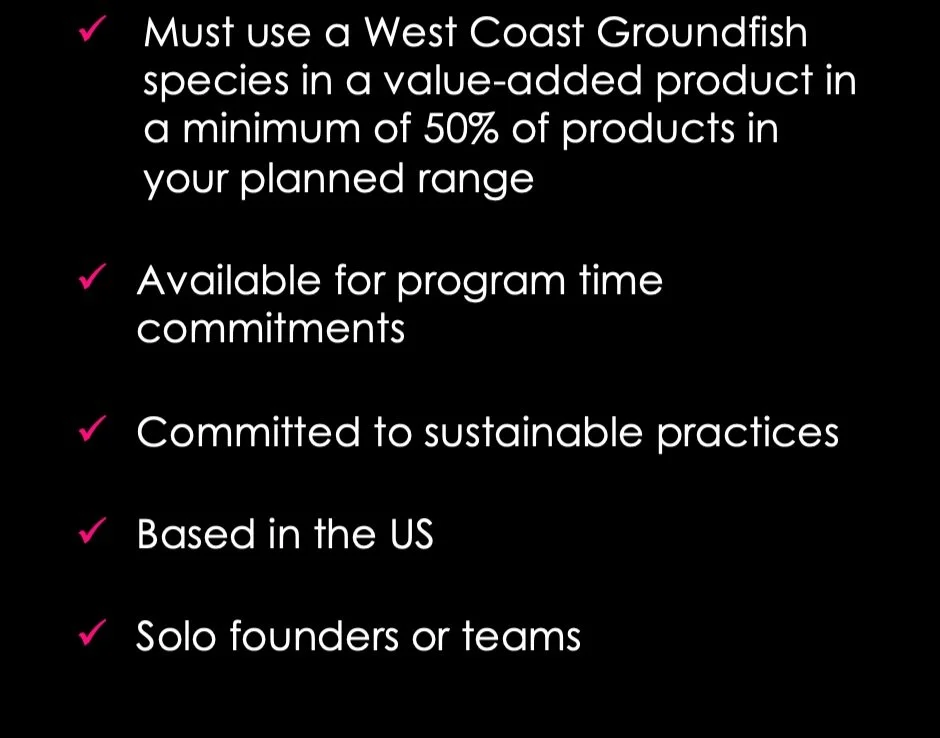 Yes. Our Catch+Create Accelerator program is open to early-stage startups and small businesses with the ambition to grow their packaged groundfish business. You are eligible for our program if you have a packaged groundfish product that is currently still in limited distribution (i.e. that you sell at your local farmer’s markets, on your own website, or in select stores). We also encourage you to apply if you want to change an existing non-groundfish product into a groundfish product.